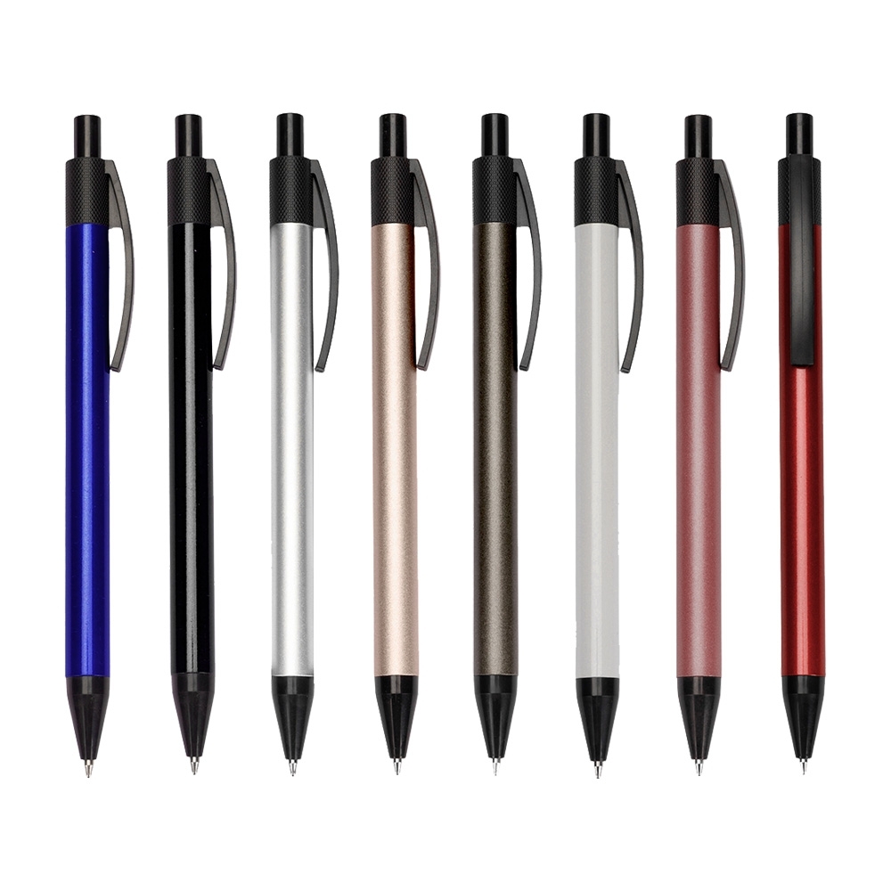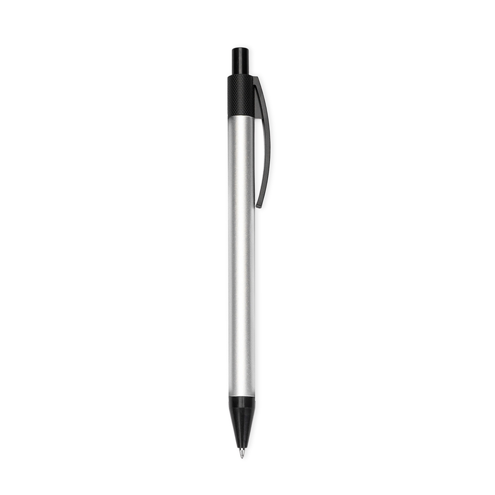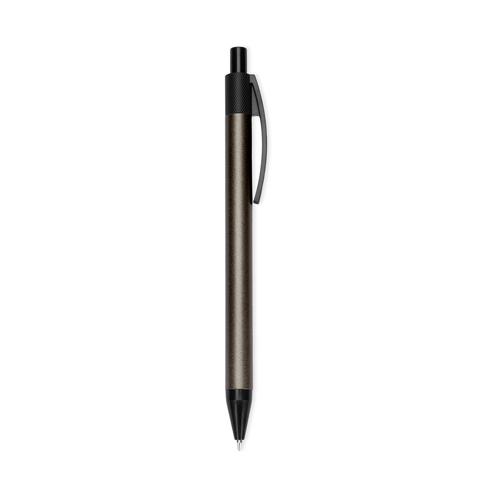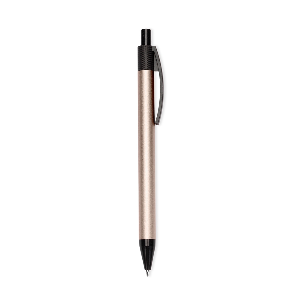 Caneta de corpo metálico, ponteira e clip em plástico e acionamento por clique. Possui carga esferográfica azul de 1.0mm, proporcionando uma pegada leve para uma escrita precisa.